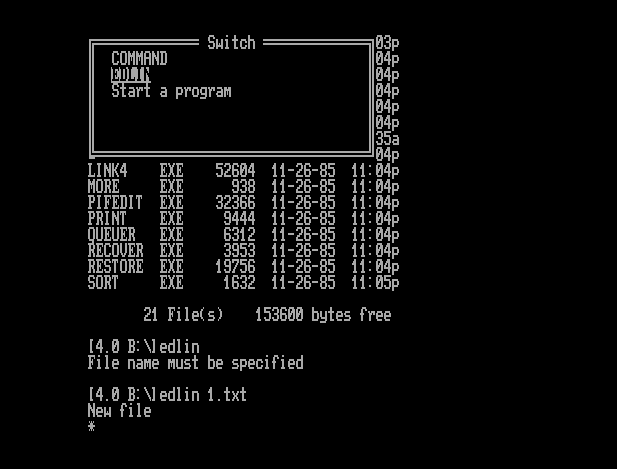 | Multitasking MS-DOS 4.00M rev 6.7 Запущена "переключалка" задач (вызывается по нажатию Alt). Сейчас есть две задачи - COMMAND (просто консоль) и EDLIN - построчный текстовый редактор (с диска 2). Работает это всё под эмулятором SPC/XT в режиме эмуляции IBM PC/XT 5160. Оригинал (alt 2) - Альбом Следующая Загрузил uav, 2020-04-03 11:32:31 |