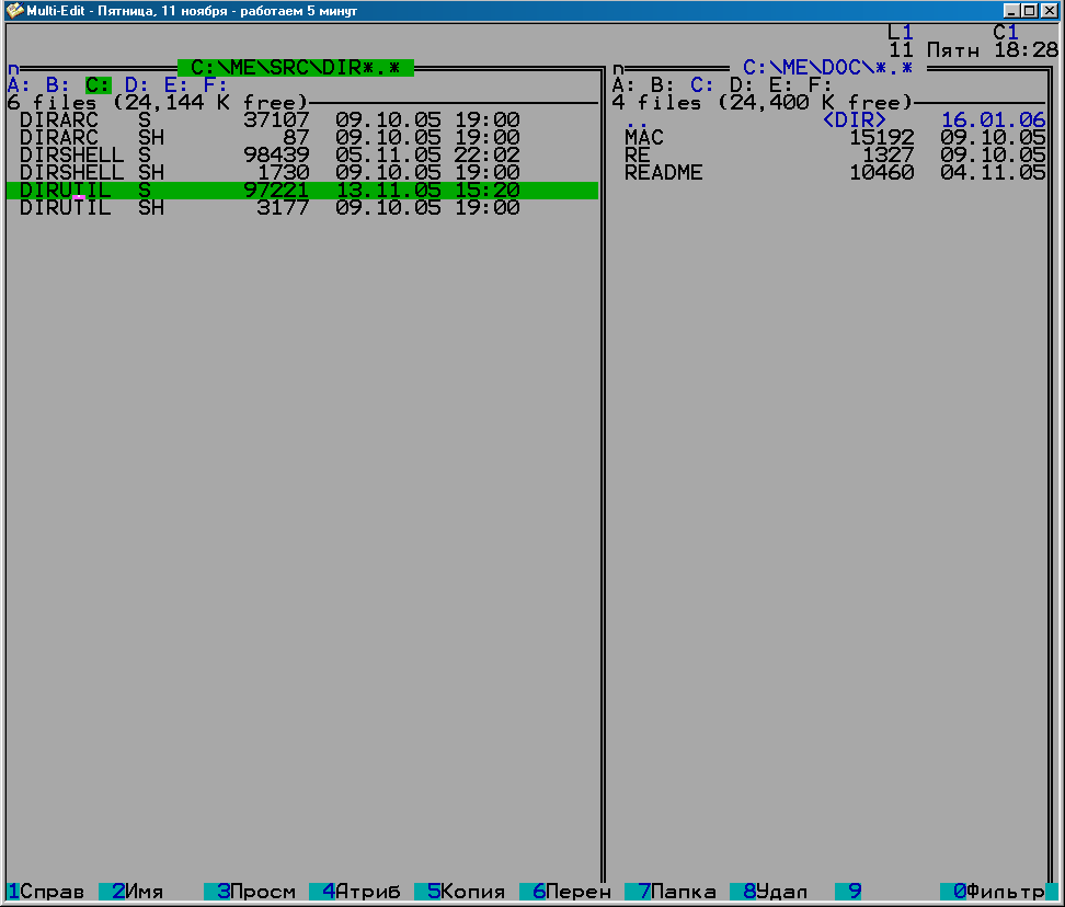 10. Нажимаем клавишу 'u' — четвёртую букву имени нужного нам файла. Мы переместились в списке на файл DIRUTIL.S. Оригинал (alt 2) - Альбом Предыдущая - Следующая Загрузил SergeCpp, 2011-11-11 19:20:05 |