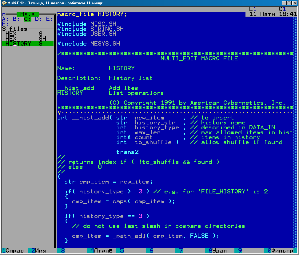21. Нажимаем клавишу 'i' — вторую букву имени нужного нам файла. Мы переместились в списке на файл HISTORY.S. Просматриваем его (см. 'Multi-Edit 7.0 — быстрый просмотр файлов и каталогов'). Оригинал (alt 2) - Альбом Предыдущая - Следующая Загрузил SergeCpp, 2011-11-11 19:24:21 |