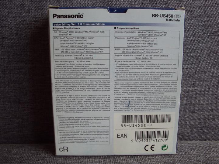 Сзади упаковки Panasonic RR-US450 с системными требованиями к ПО