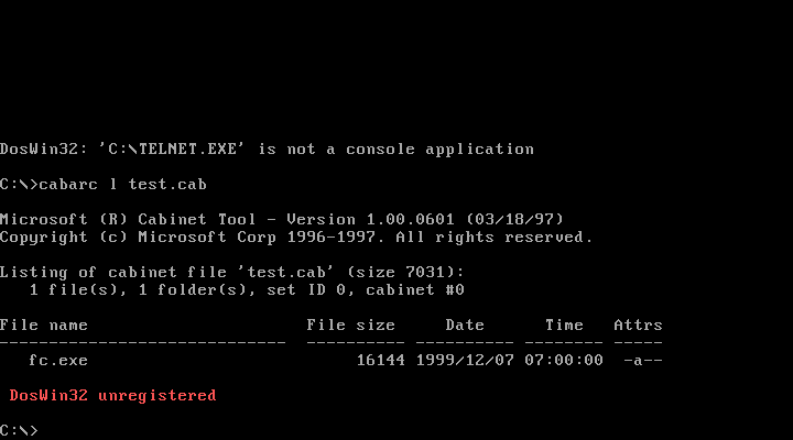 | Пример использования Сначала был запущен run32, который сделал DOSWin32 резидентным, затем была неудачная попытка запустить telnet (сообщение о том, что это не консольная программа), затем удачная попытка запустить CABARC (Win32-приложение). Внизу видно сообщение о том, что DosWin32 не зарегистрирован. Оригинал (alt 2) - Альбом Загрузил uav, 2025-08-21 12:21:45 |