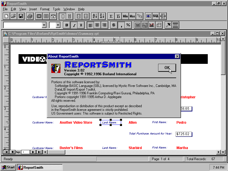 Подпрограмма ReportSmith 3.02(встроенная в Borland Reflex 2.0)