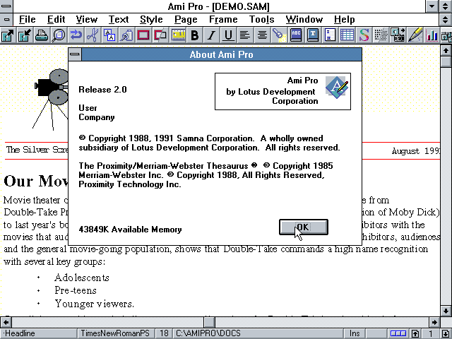 Окно About в Ami Pro 2.0