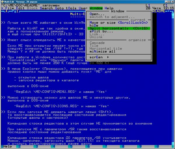1.1. Чтобы разделить окно на две части горизонтально, нажимаем ControlS или выбираем пункт 'Split horizontally' в меню Window. Под 'разделением окна' понимается уменьшение размера исходного окна и создание на освободившемся месте нового окна, связанного (Linked) с уменьшенным. Оригинал (alt 2) - Альбом Предыдущая - Следующая Загрузил SergeCpp, 2011-04-28 20:02:07 |
