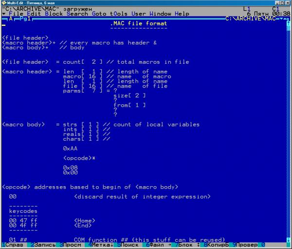 21. Открываем извлечённый файл MAC в редакторе — действительно, информация о формате MAC-файла может пригодиться в будущем. Сохраняем файл MAC в каталоге ME\DOC. Замечание: файл MAC находится в каталоге ME\DOC архива ME_PLUS.RAR. Оригинал (alt 2) - Альбом Предыдущая - Следующая Загрузил SergeCpp, 2011-05-06 00:41:55 |