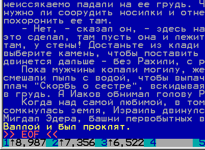 2.13. Если нажать Shift, то в 'строке F-клавиш' внизу экрана в графах 1, 2, 3 мы увидим, что все три установленные позиции — выше по тексту (три стрелки вверх); мы увидим также, на сколько строк выше текущей находятся строки с этими позициями. Оригинал (alt 2) - Альбом Предыдущая - Следующая Загрузил SergeCpp, 2011-05-15 22:32:09 |