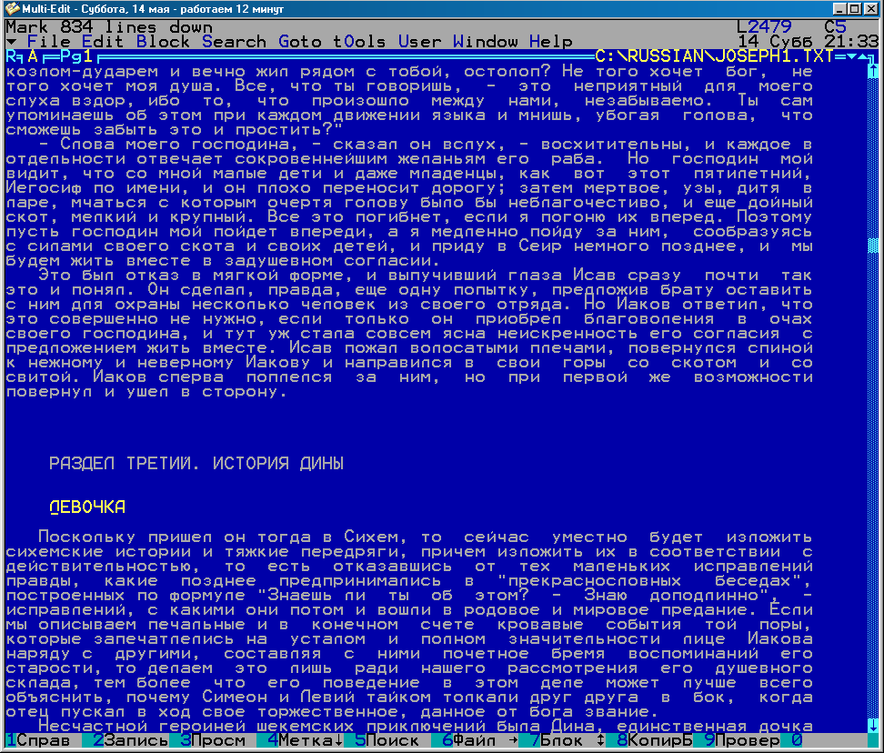 2.16. Нажав F4, мы перешли к ближайшей ниже по тексту позиции. В строке сообщений (вверху слева) написано, что вниз мы перешли на 834 строки. Замечание: во время перехода по F4 или ShiftF4 в 'строке F-клавиш' внизу экрана в течение некоторого времени показывается направление смещения и смещение в строках для установленных позиций перехода. Позиция, к которой производится переход, обозначена 'Здесь'. Оригинал (alt 2) - Альбом Предыдущая - Следующая Загрузил SergeCpp, 2011-05-15 22:33:24 |