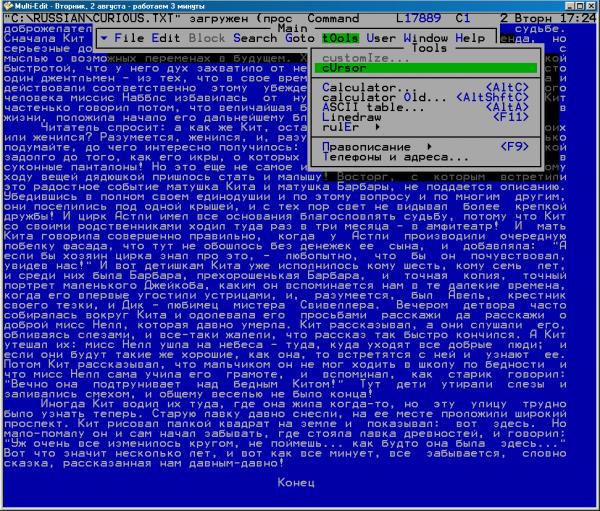 6. Книга прочитана. Для включения как отображения курсора так и подсветки текущей строки выбираем пункт Cursor в меню Tools (для входа в главное меню нажимаем Esc). Оригинал (alt 2) - Альбом Предыдущая - Следующая Загрузил SergeCpp, 2011-08-02 20:52:23 |